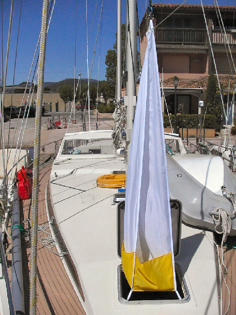Pour la ventilation au mouillage ou au port, nous avons équipé la cabine avant d'un fantôme pyramidal à 4 entrées que l'on trouve facilement (Swisstech notamment). 4 crochets sur le chambranle intérieur du capot et un bout au sommet du fantôme se fixe en entourant les 2 écoutes de génois. Pas original, mais très efficace.