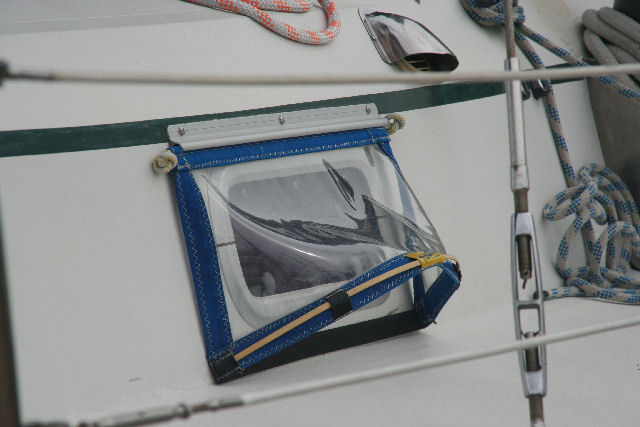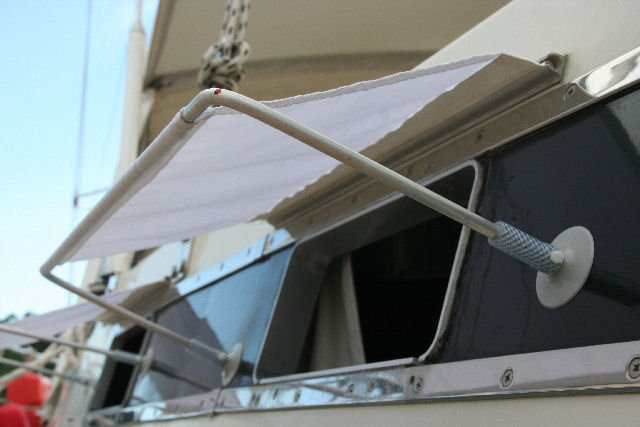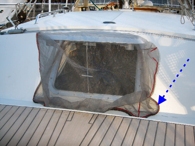 La moustiquaire pour les capots de pont. Le modèle Mosquito Net est parfait. Il est vendu notamment par Swisstech et Kompass. Prendre une taille bien ample pour être certain de couvrir même grand ouvert. C'est du travail bien fait avec une bordure en amarre plombée. On peut réaliser ceci soi-même, mais ce n'est pas si facile de coudre de la moustiquaire.