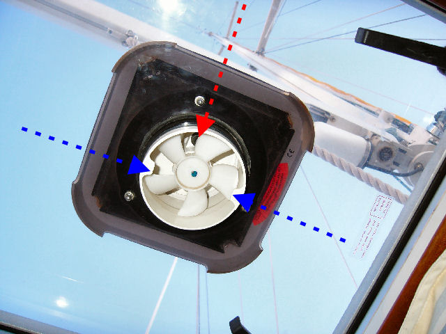 Les insectes sont arrêtés par des grilles incorporées. L'extracteur intègre une chicane qui évite à l'eau de mer de rentrer dans la cabine. Par vrai mauvais temps, on remonte une collerette depuis l'intérieur et l'extracteur est étanche (flèches bleues).