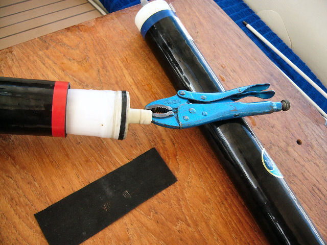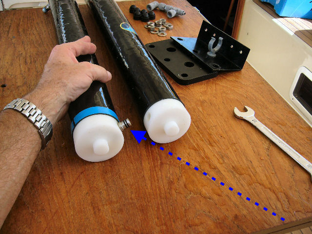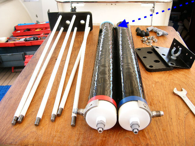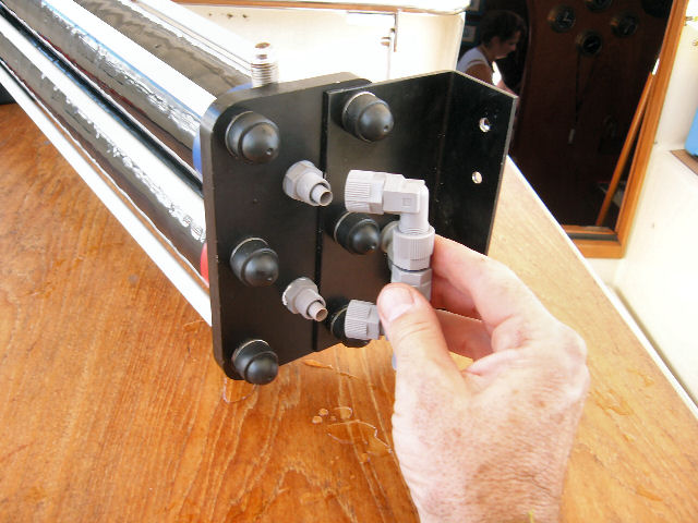 Avant d'attaquer les membranes, il convient d'abord de démonter le porte-membranes. Trois écrous des jonctions coniques faciles à défaire (entrée et sortie eau de mer + sortie eau douce). Et 4 à 6 visses suivant la fixation du porte-membranes au bateau.