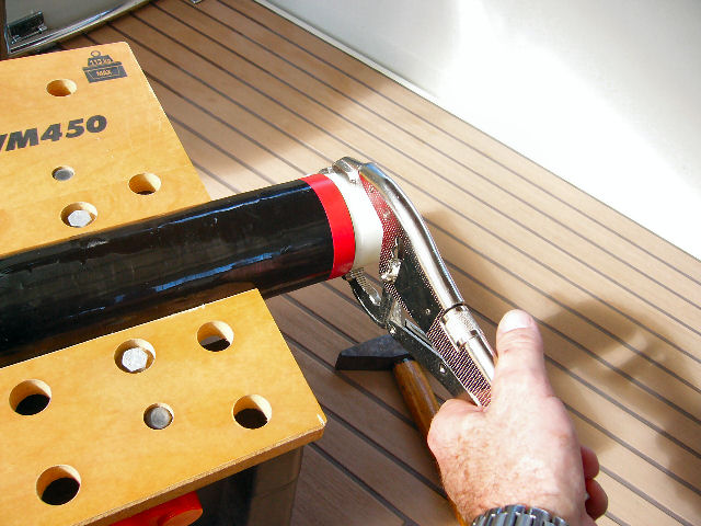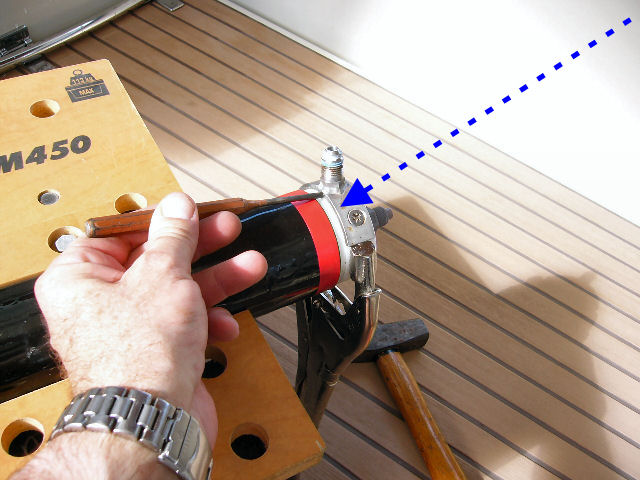 Coincer le tube dans un établi Black&Decker facilite beaucoup la suite des opérations. Pincer la tète du tube avec une prince GRIP large bec, sans trop serrer. Ceci juste derrière les plateformes de fixation des embouts haute pression