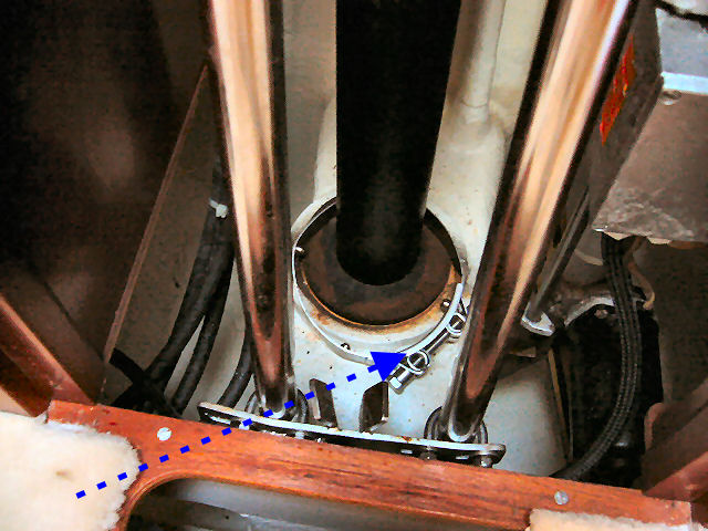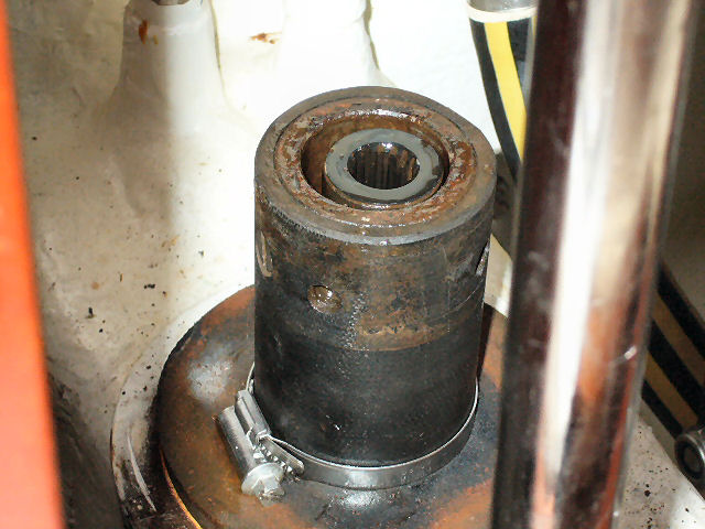 Une fois le tube rentré, reposer le collier de sécurité à 10 cm du haut du tube. Pas plus, sinon il n'y a pas assez de place pour démonter l'obus. Oter l'adhésif et l'obus. Enduire le haut du tube et les 4 boulons à la graisse silicone. Remonter le tube dans le moteur et fixer les boulons sans trop serrer. Si le tube ne rentre pas à fond dans le moteur, c'est que la cavité au-dessus de l'arbre vertical n'est pas alignée avec le mandrin du moteur. Tourner un peu l'arbre avec le doigt ou un tournevis et réessayer. Terminer en reposant le collier de serrage de sécurité qui bloque les 4 boulons (assez casse-pieds) et le panneau de bois au bas du compartiment moteur. C'est fini !