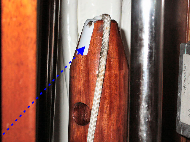 L'obus de bois (outil Amel) est introduit sur le tube et fixé avec le boulon sans tête du haut du tube (un boulon de rechange st fourni avec le kit Amel). Clé hexagonale. Ici, il faudrait étanchéifier la jonction obus-tube avec le ruban adhésif fourni dans le kit Amel (voir opération 28). Cela n'a pas été fait, car le démontage complet du tube est prévu