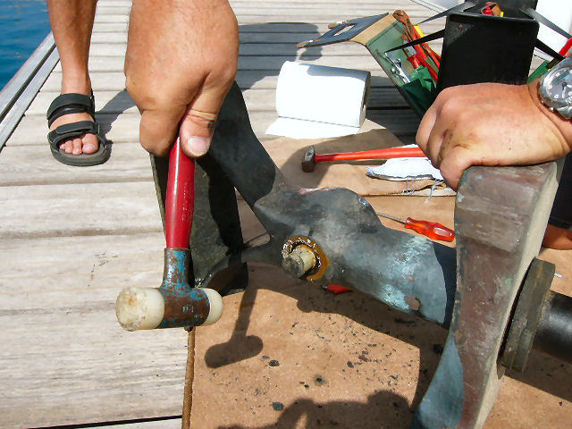 La goupille du porte-hélice est replacée à la main ou délicatement au maillet, après avoir été enduite de graisse silicone