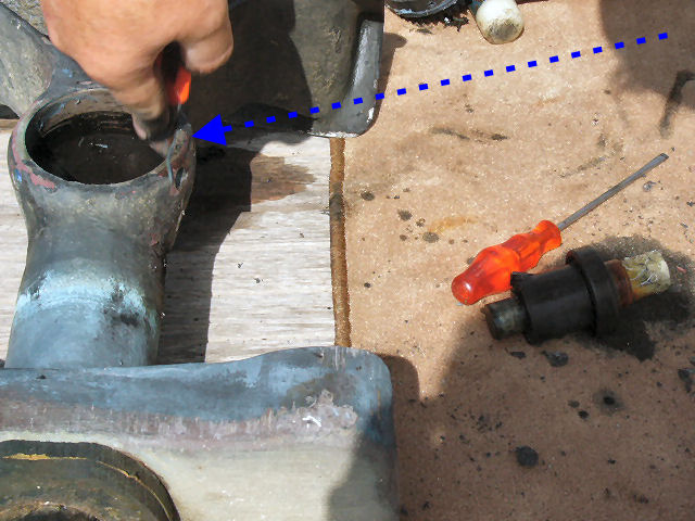 L'embase est remise debout et on injecte 0,30 litre d'huile SAE 90 entre l'arbre et le tube. Un petit truc : boucher du doigt la cavité de l'arbre pour éviter au remontage, de faire gicler l'huile qui y est rentrée. Un bidon à embout facilite grandement la tâche