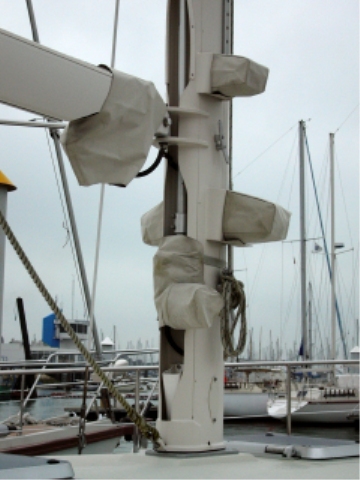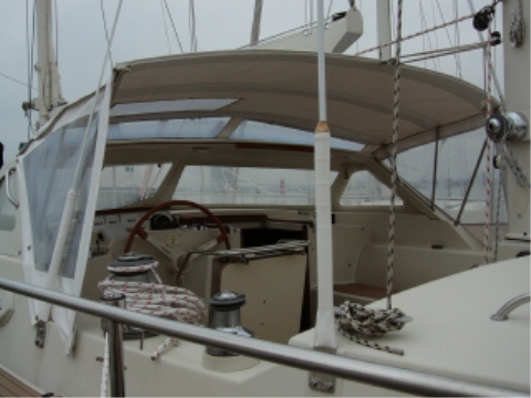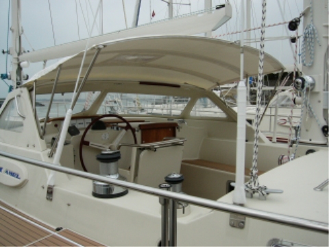 A y regarder de plus près, je me rends compte de la variété de ces toiles plastifiées, car outre les modèles standards du chantier Amel, il y a également toute une gamme issue de réflexions des propriétaires. Ceci dit, les maîtres des tauds sont les plaisanciers US : tauds de soleil couvrant tout le bateau en tissu high tech, housses pour tout, y compris les jerrycans ...