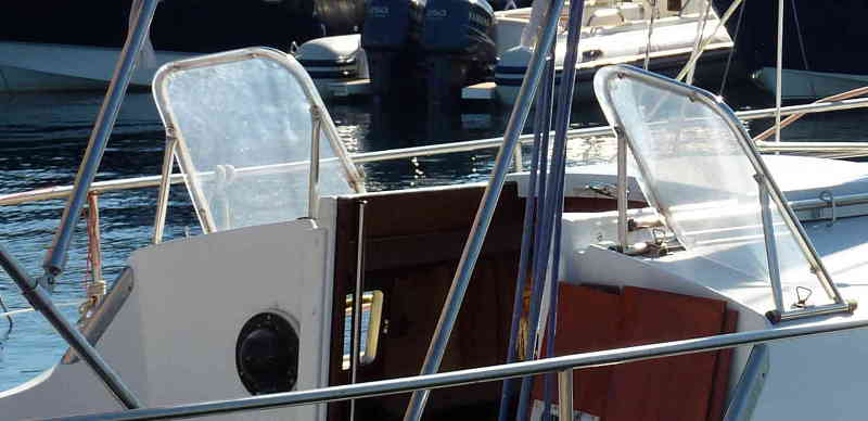 Sous le vent est équipé de pare brise en plexi sur armature inox genre spider anglais, je vais voir à l’usage comment ça se comporte. à première vue, excellente visibilité avant, sans doute bonne protection aux embruns, mais pas d’ombre!