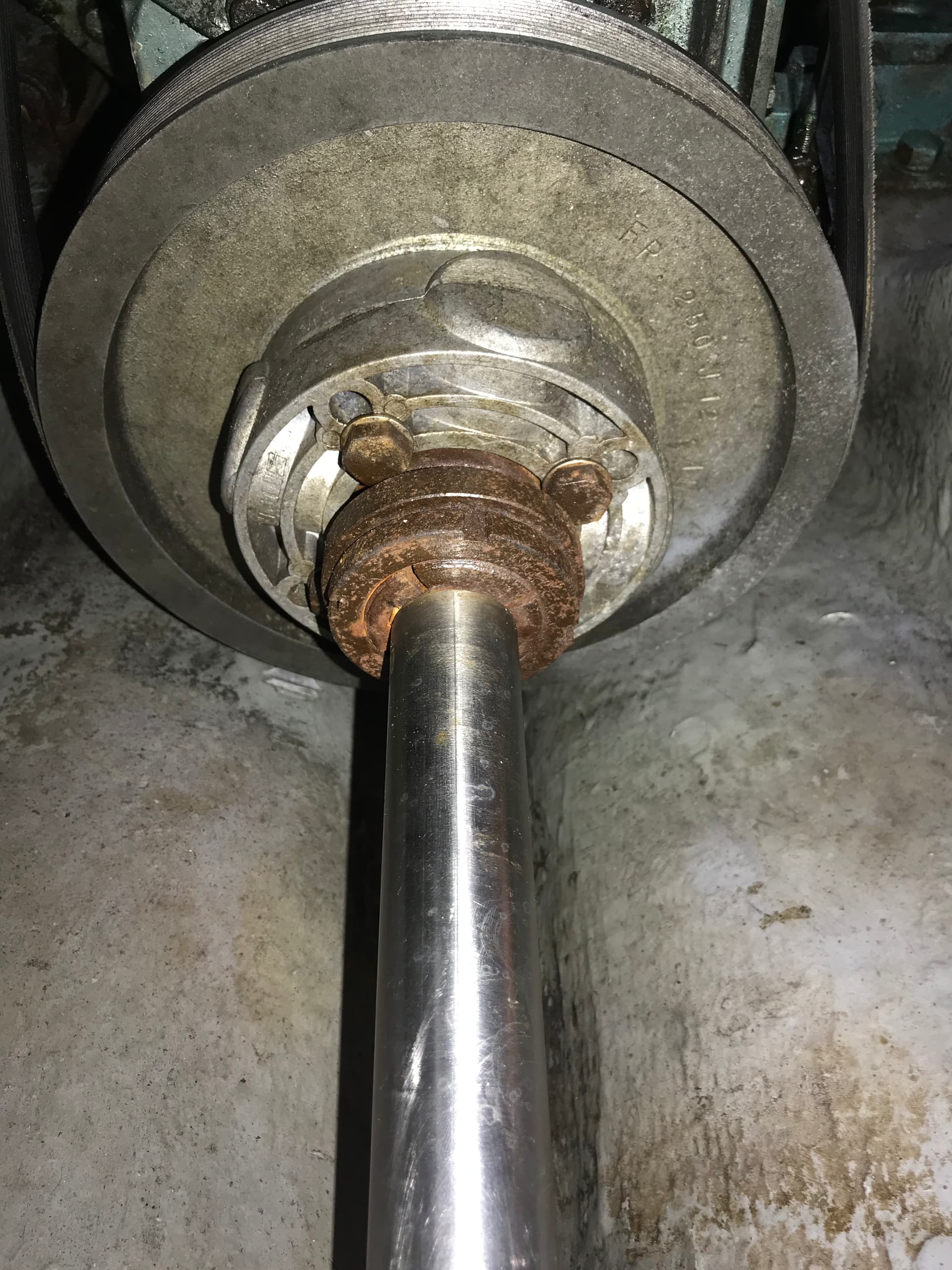 Le plus long et le plus difficile est le desacouplement de l’arbre. Environ deux heures et demi pour moi. Une première bague qui se devise bien grippée, une deuxième à “chasser” bien grippée aussi . Les quatre boulons enserrant les deux parties de l’accouplement vêtus et la grande poulie de l’alternateur et se rattachant à l’inverseur.