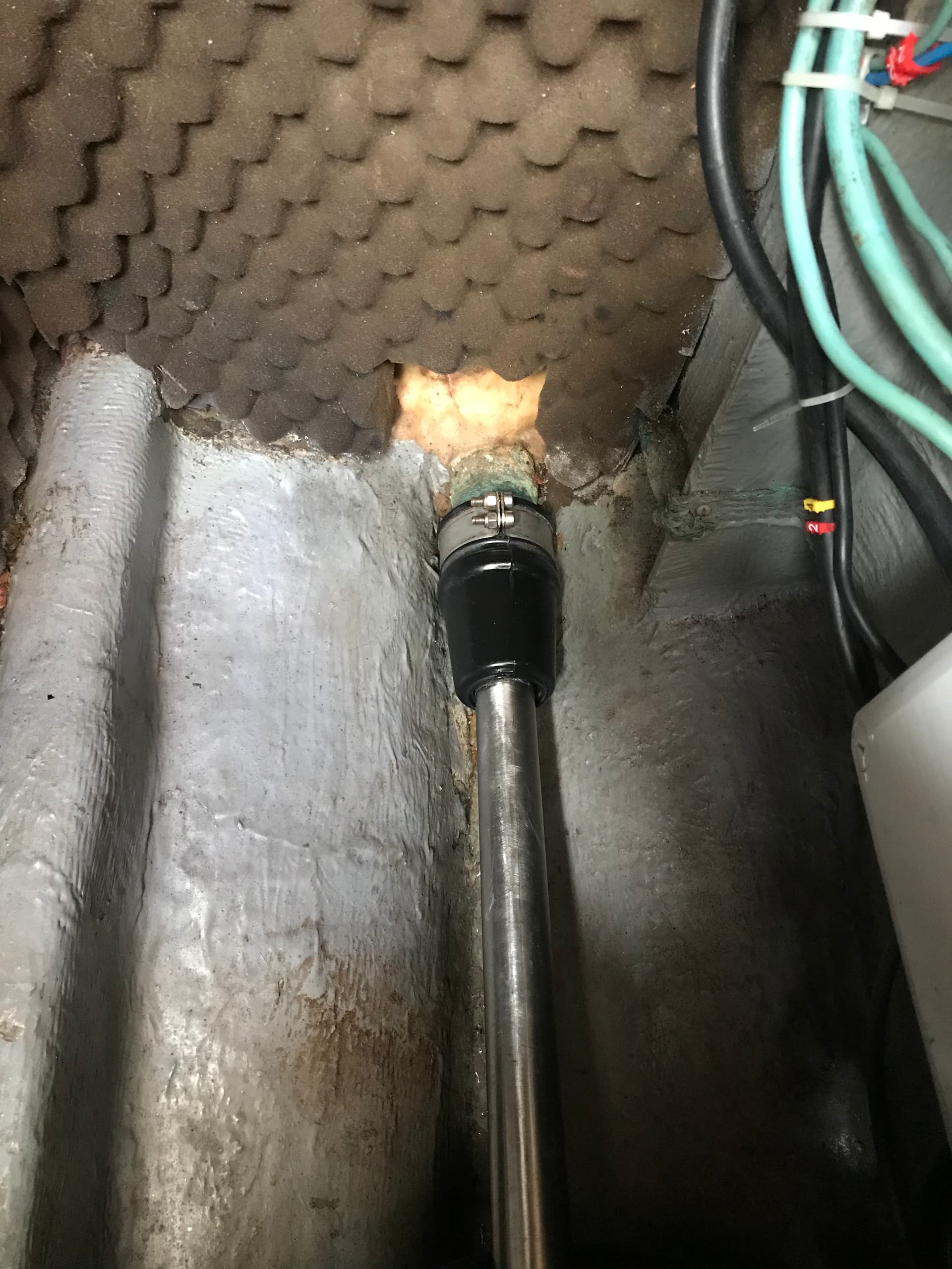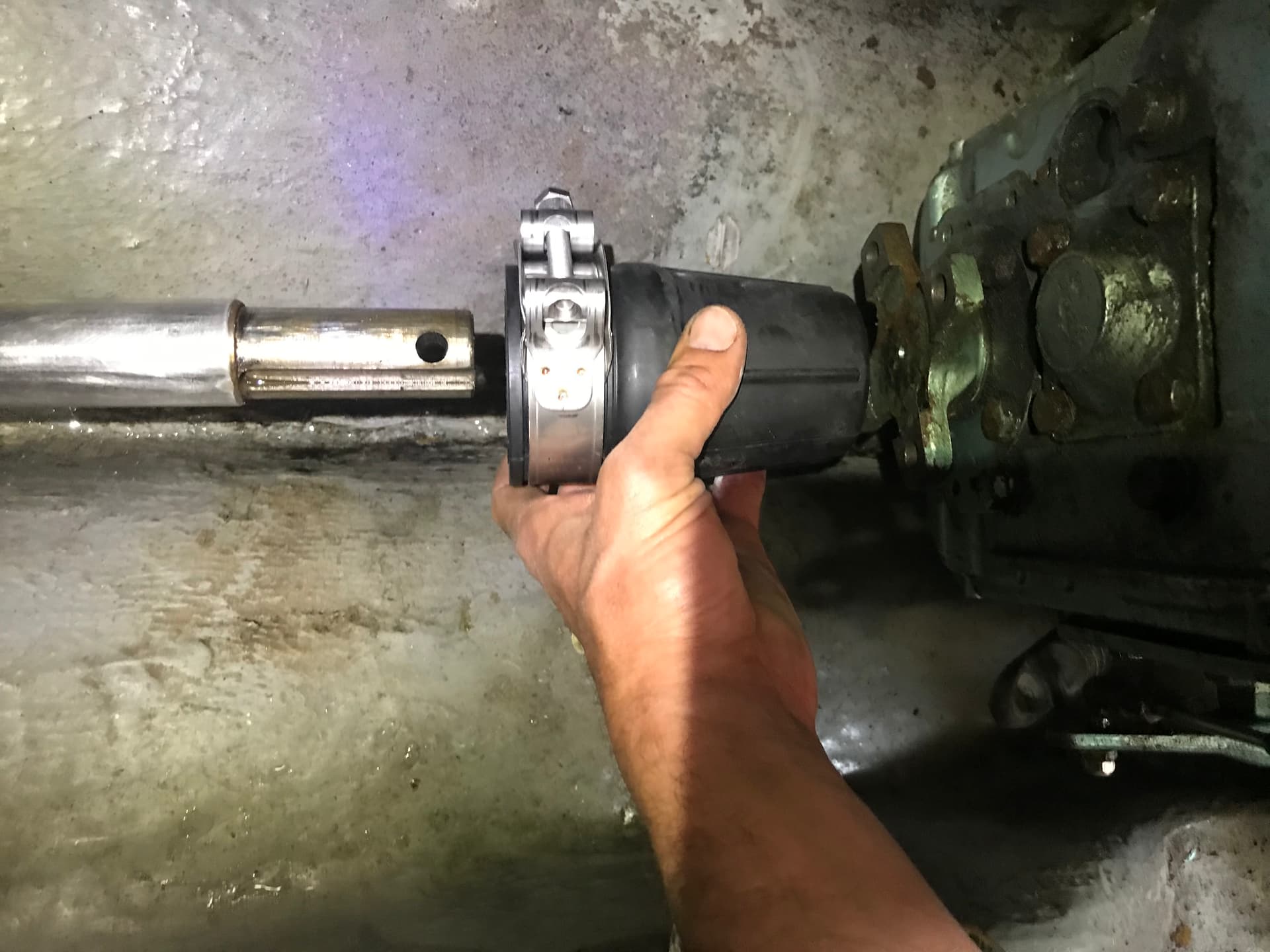 Libérez l’arbre de l’accouplement et faites-le glisser vers l’arrière pour gagner suffisamment d’espace pour retirer l’ancien joint et installer le nouveau. J’ai l’hélice d’origine à 3 pales : en tournant légèrement l’arbre, les pales de l’hélice peuvent laisser passer l’aileron entre deux d’entre elles, gagnant ainsi un peu d’espace vers l’arrière.