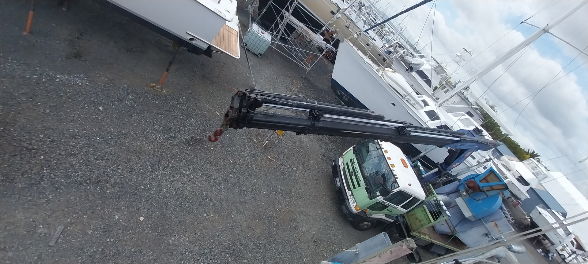 Aucun problème, ça passe très bien sans démontage des bas haubans d’artimon. Prévoir seulement un véhicule de grutage à bras télescopique permettant de “s’infiltrer” entre les haubans et à l’arrière du hard top.