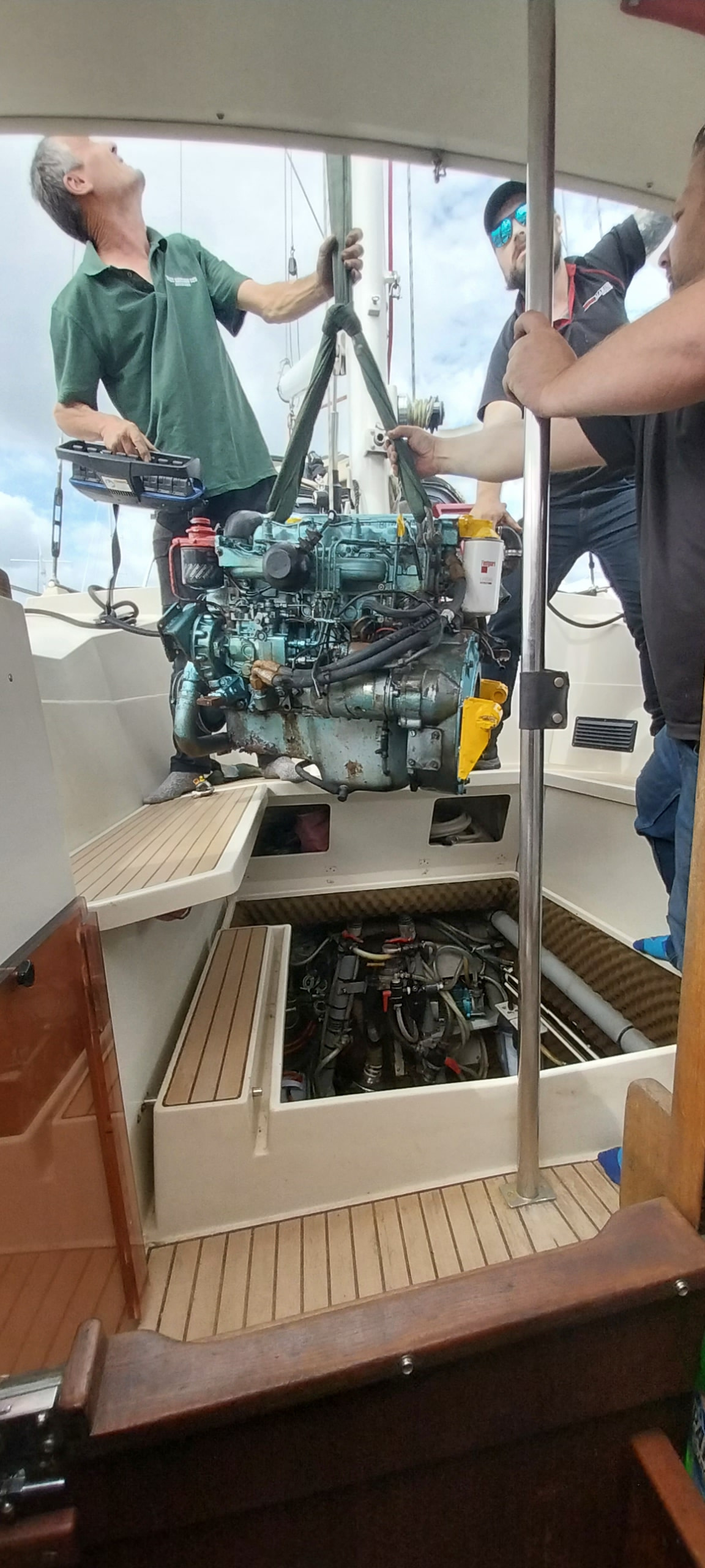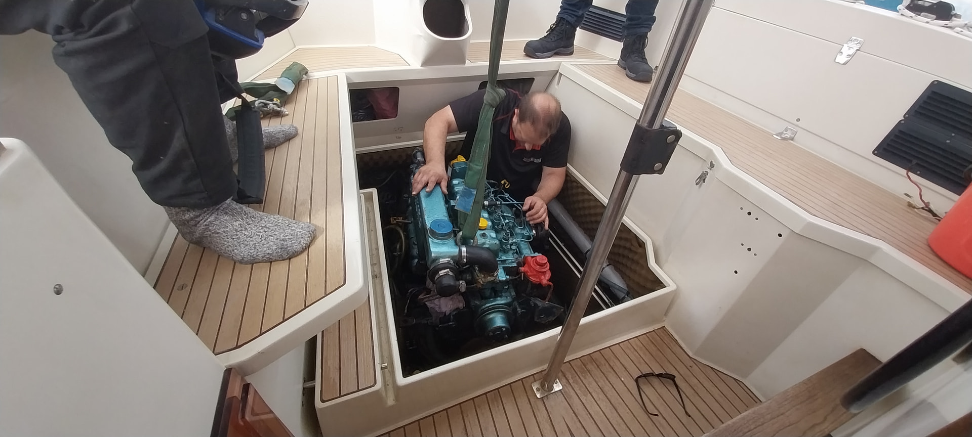 Démonter éventuellement le siège de barre pour faciliter le passage du personnel au moment de la sortie du moteur de sa cale.