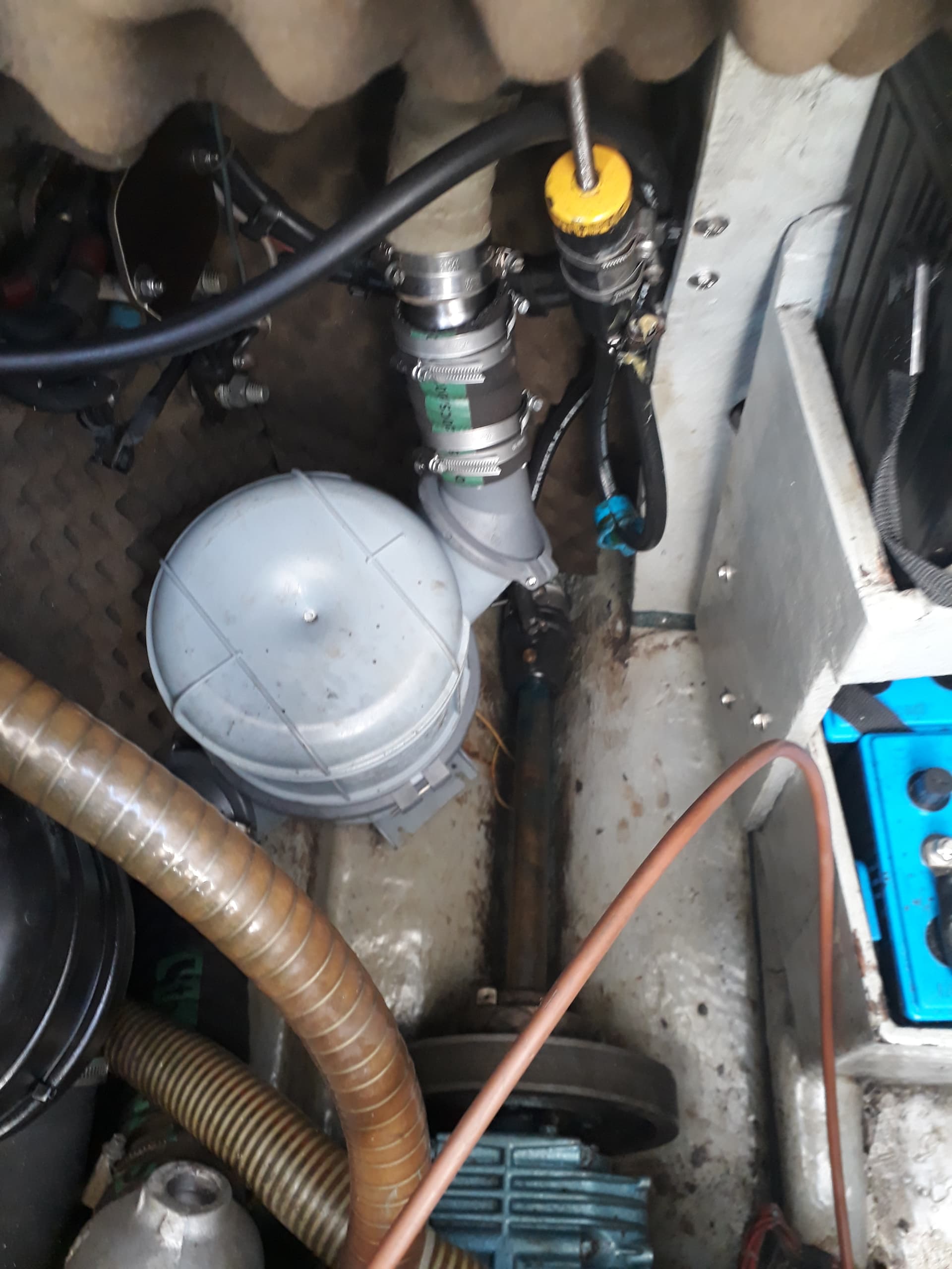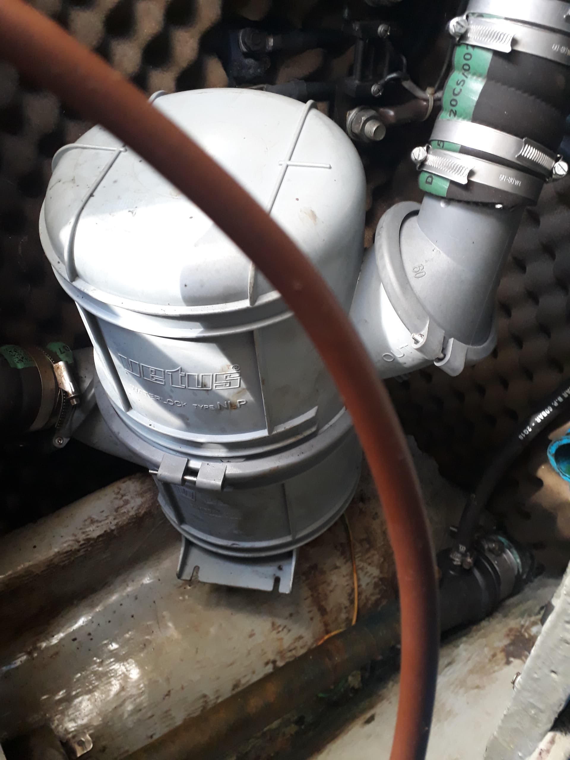 Effectivement, je ne vois pas de boucle ou d’anti-siphon entre la sortie d’échappement du 4108 et le pot en inox, mais il y a bien une boucle au dessus de la flottaison entre le pot et le passe-coque d’échappement.