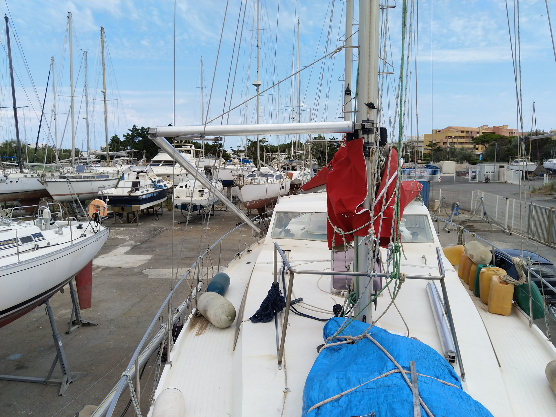 Par contre ca doit plus chaud a mettre a poste en mer, car pour aller glisser le tangon dans l’anneau au niveau de la traverse des haubans …!